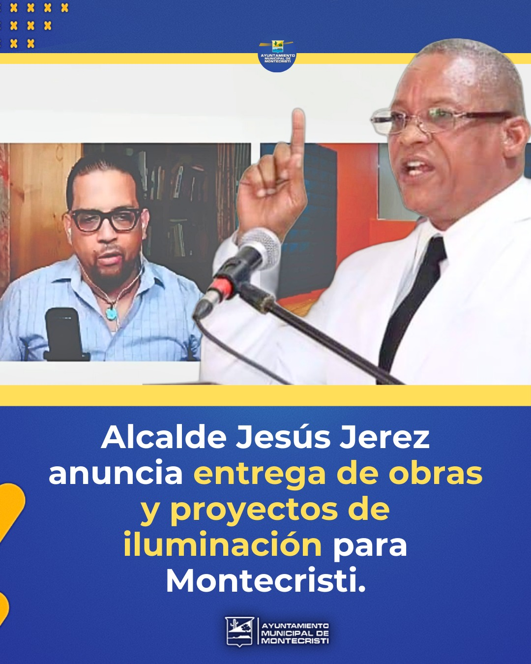 El alcalde del municipio de Montecristi, Jesús Jerez, anunció la pronta entrega de varias obras que beneficiarán a distintas comunidades, durante su participación en el programa Reencuentro, dirigido por el comunicador residente en Estados Unidos, Jeffrey Cabrera Castro. En el espacio, el edil respondió con firmeza y claridad a inquietudes de la población sobre temas de interés municipal.