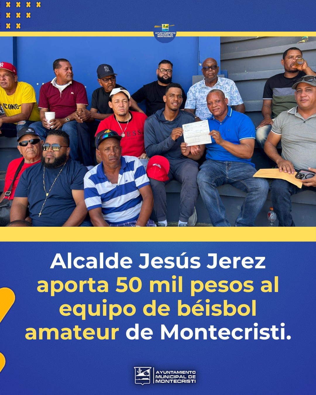 Montecristi, Rep. Dom.- El alcalde Jesús Jerez realizó este domingo un importante aporte económico de 50 mil pesos al equipo de béisbol amateur de Montecristi, como parte del compromiso asumido de entregar un total de 150 mil pesos en apoyo a la disciplina deportiva.