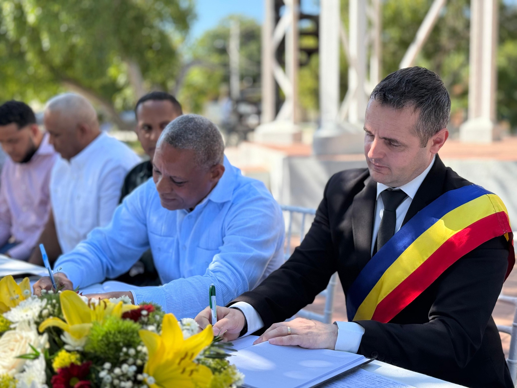 En un acto solemne celebrado en el emblemático Parque Reloj, símbolo del municipio de Montecristi, la Alcaldía de Montecristi firmó un histórico acuerdo interinstitucional y de cooperación con el municipio de Mediesu Aurit, Rumanía. El evento inició con los himnos nacionales de ambos países, interpretados por la Banda de Música Municipal, seguidos por palabras de bendición a cargo de Nelfa Carrasco y el diacono Ronald Díaz.