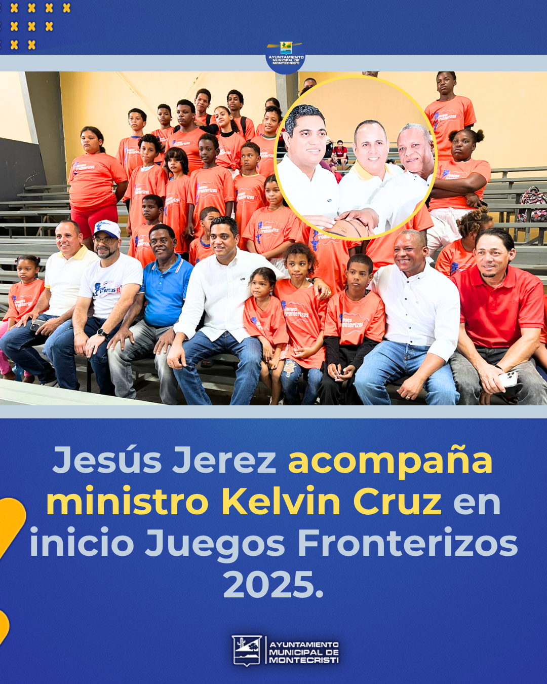 El alcalde de Montecristi, Jesús Jerez, acompañó al ministro de Deportes, Kelvin Cruz, durante el acto de apertura de los Juegos Fronterizos 2025, realizado este fin de semana en el municipio cabecera. La actividad marcó el inicio oficial de este importante evento deportivo que se desarrollará en toda la línea fronteriza del país.